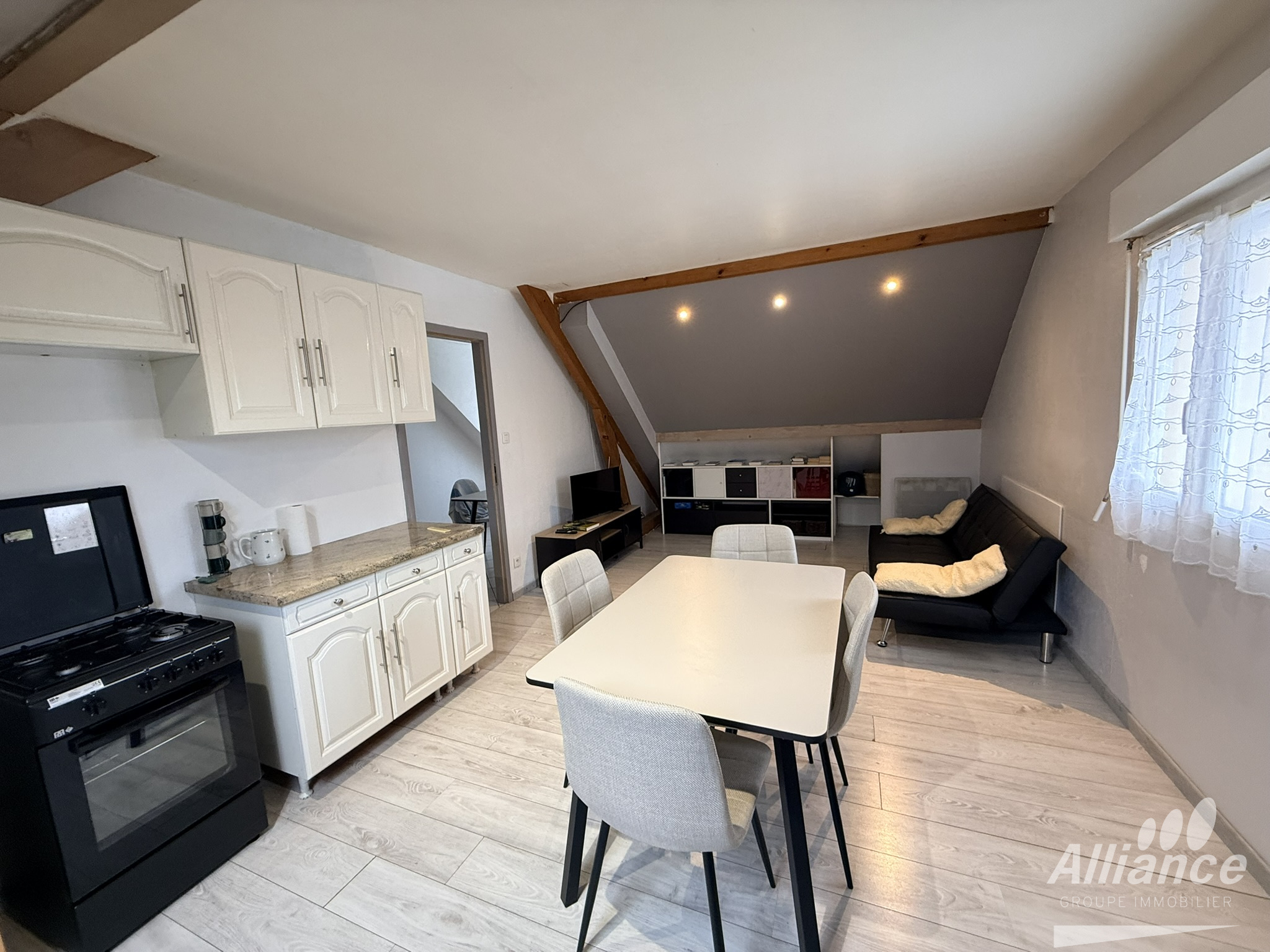 Appartement meublé de type T4 de 74 m² au sol dans maison individuelle des années 2000 à quelques minutes de la frontière Suisse, comprenant une entrée, une jolie pièce à vivre avec cuisine ouverte sur salon/séjour, 3 chambres dont une très grande et une petite, une salle d'eau, un espace bureau. Possibilité de bénéficer d'une place de parking