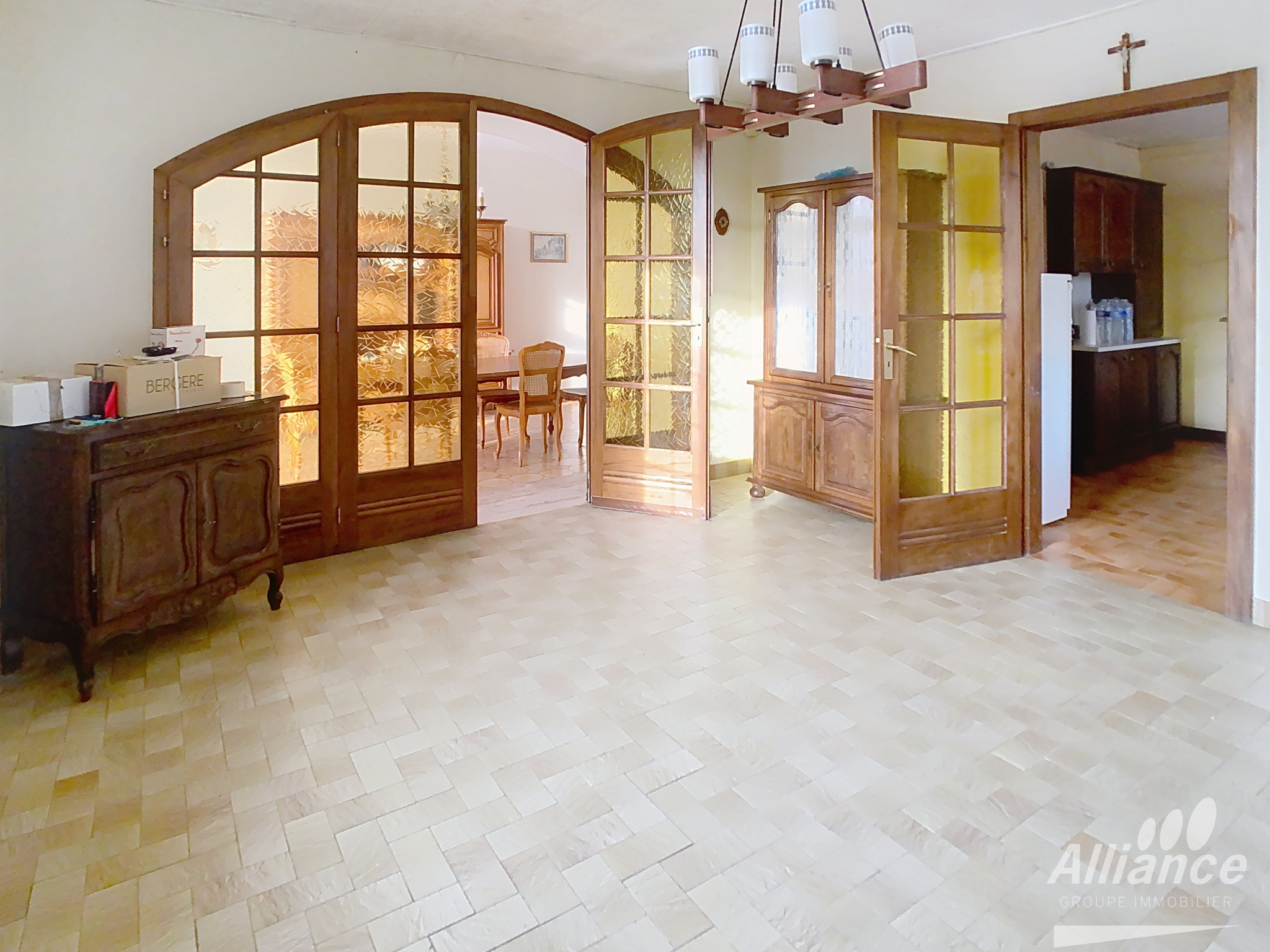 Elle comprend : une vaste entrée, salon-salle à manger agrandi dans la partie attenante avec porche, cuisine, salle de bains, wc. A l'étage : trois chambres dont deux en enfilade. Grenier avec deux pièces totalement à rénover. Vaste partie encore aménageable. Double garage attenant.
